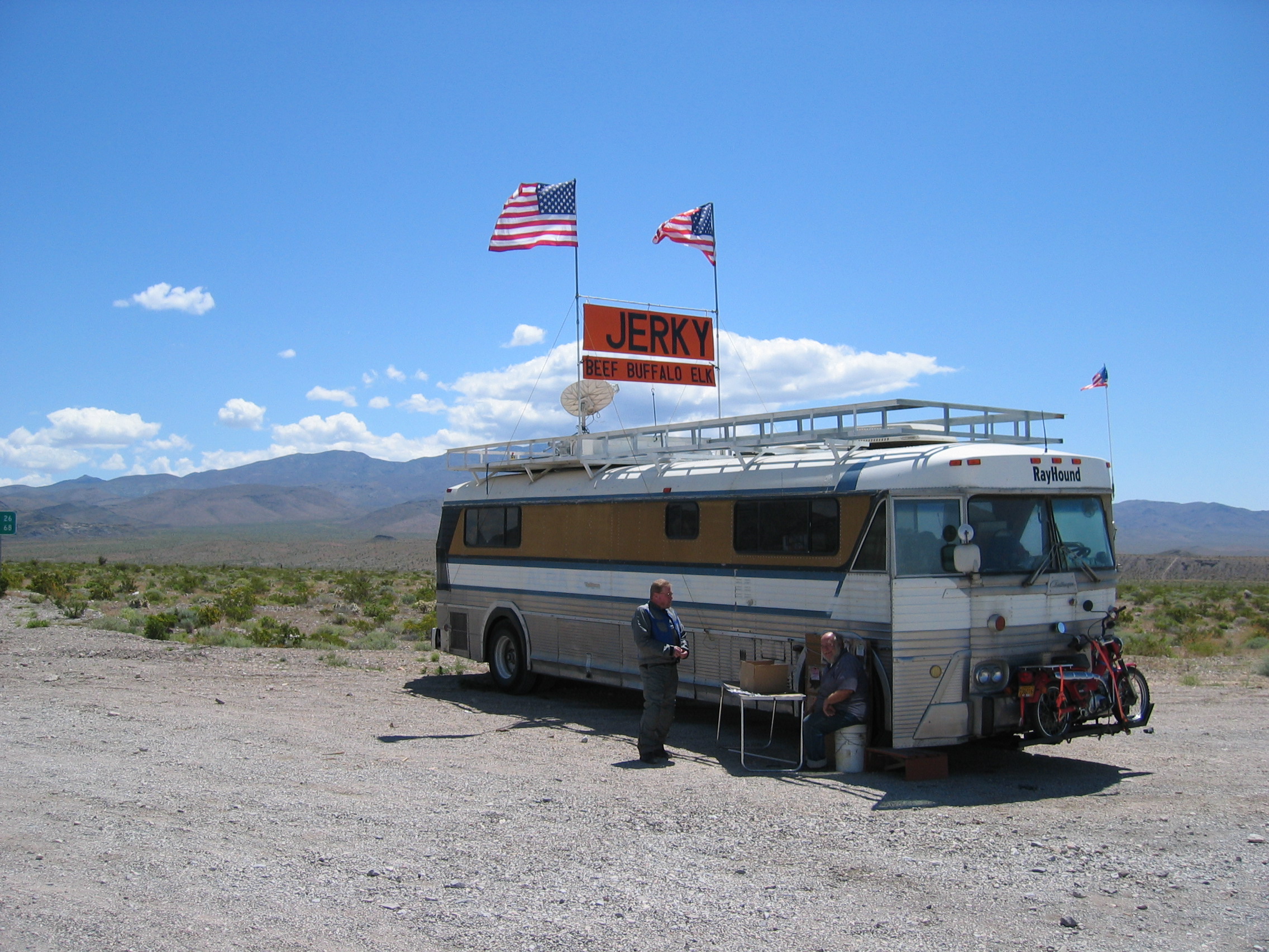Pictures are up on the main page, but here are some highlights. Yes, I did buy beef jerky from the nomad selling it out of his RV exactly 68 miles outside of Vegas. He says he's spent a lot of time out here in the desert around Area 51 (which we're sorta by) and hasn't seen any aliens but he's been talked to by a bunch of guys in air force uniforms driving large blue unmarked suburbans. He says they never buy any jerky either (it's tasty, not sure why they wouldn't). He's gets run off by the cops sometimes, and he's got a permit to sell on Indian lands and has used that against the cops that try to run him off when he's parked by the reservation. He's on good terms with the Indians apparently. His Honda generator uses 1/12 gal per hour to run his fridge, computer, TV, satellite setup and lights. Hmm. Good to know.