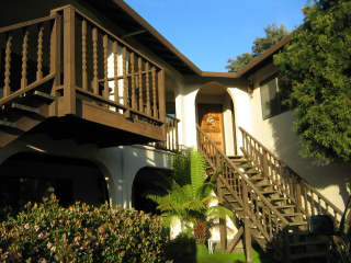 After we got home and the swelling went down we went to Santa Cruz for another round of looking at condos. I didn't like any of them... until we got to the last one. It's really "funky", Spanish style in a little complex with lots of trees and decent parking. What's really cool is the unit has a 10'x25' deck that you can see the ocean from. It's a long way off in the distance but you can see some blue. I don't care about the view so much, rather that it's BIG for a deck on a condo and very private. The unit needs about $25k in remodeling work but wasn't too bad compared to some of the crap we've seen. The woman also liked another place that was much newer (built in '95) but I thought it was just too generic and boring. It was also a 1 bedroom place, but had a tiny loft which was just big enough for a queen sized mattress. The whole place stuck of children and urine, there were 4 people living in it. Ick. Oddly, there were also 4 people living in the Spanish style one I liked, but it was vacant and had been cleaned. She's putting offers in on both. I hope she gets the one I like! :) Here is the reality pic of the one with the deck out back. The actual unit is up the stairs and to the right.