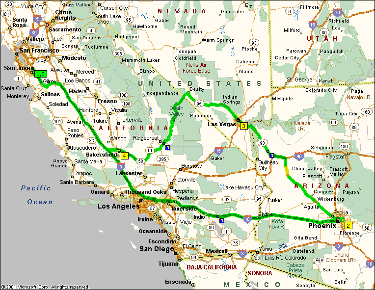 Here is the route we ended up taking. We cut the coast run off, we were both tired. We stayed the night in Blythe, Scottsdale, Las Vegas and exciting Bakersfield. The most we paid for gas was $2.98 and that was when we first gassed up in Fremont. Gas in the middle of nowhere was cheaper than at home. :(