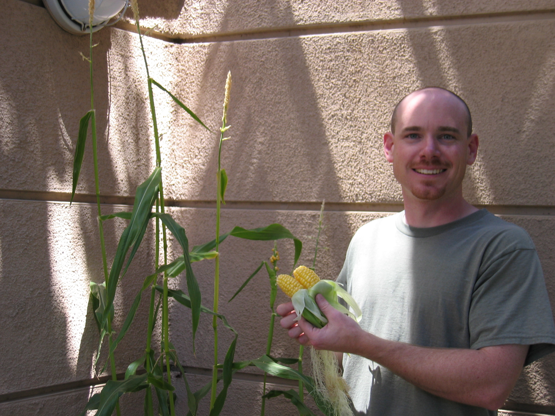 And today was harvest day. We have to clear off the patio for the outside of the townhouse to get painted, so I had to lose the corn. Mom said that the corn wasn't going to get any bigger so I should just harvest what I had and toss the plants. Today, we had a few extra bites of corn with our BBQ (and I do mean a few bites....):