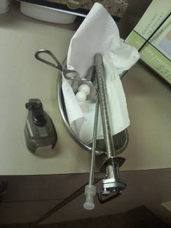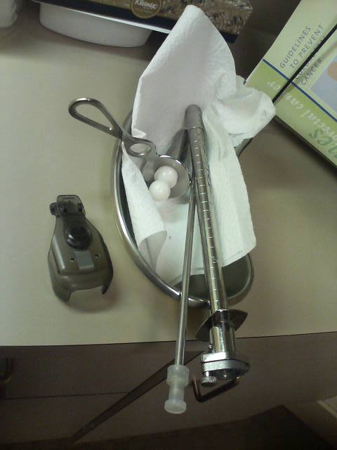 I'll let the equipment speak for itself. That whole "it won't hurt, you'll just feel a pressure" thing is pure crap. Having a metal rod up your ass 15cm is not 'pressure'. The Valium helped, but man is it making me dizzy. I keep falling down.