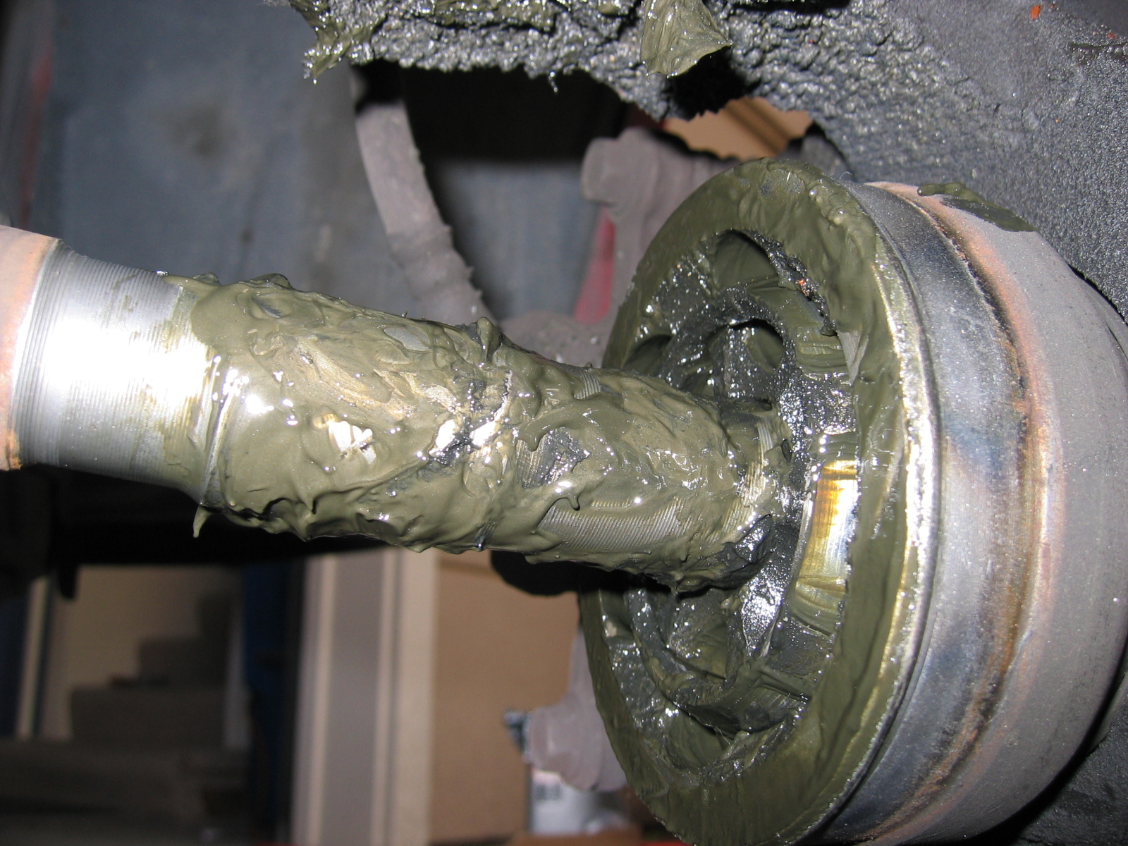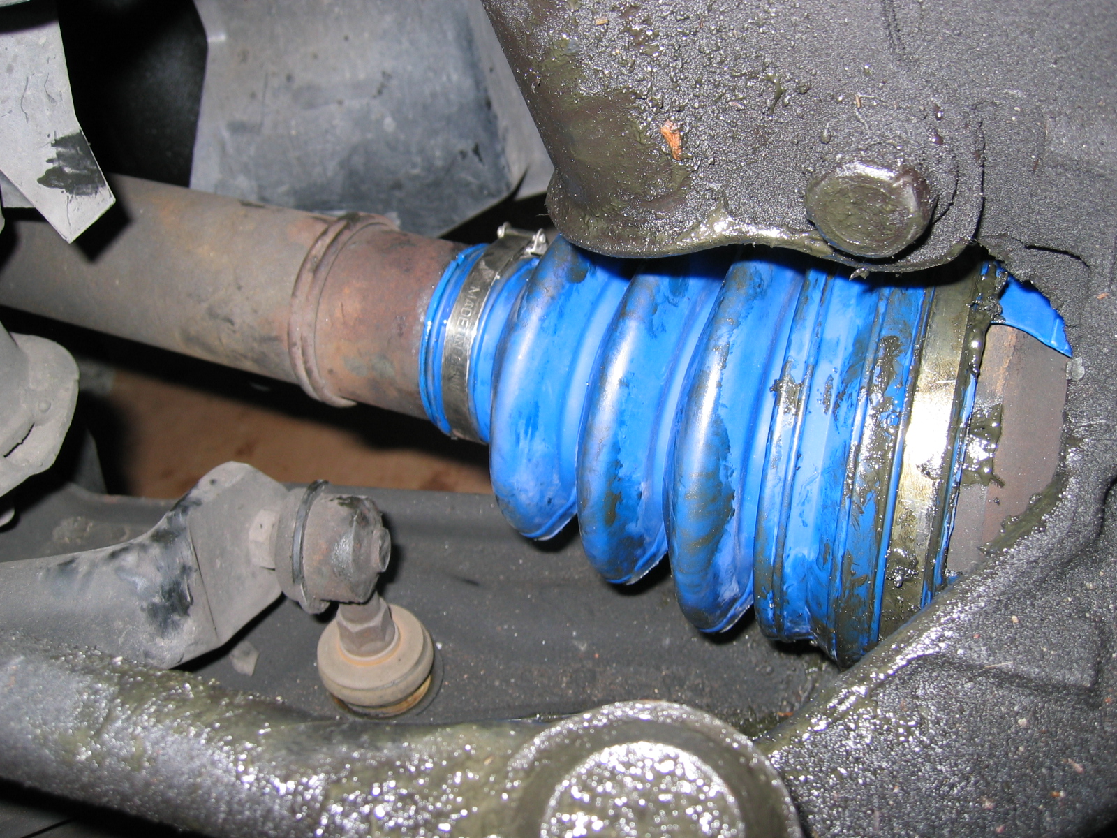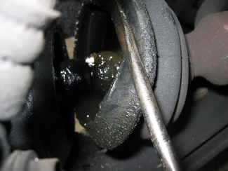 What a freakin' mess. Remind me never to try to repair a CV joint again. The whole area is coated in nasty grease and is a pain to work on. I went through at least 5 pairs of gloves trying to stay clean since the instructions say "don't touch the new boot with greasy hands" a half dozen times. I get it, the glue won't stick and the thing will fly apart at speed. Still ended up with a bunch of grease on the outside of the boot; it's impossible not to. Here are 3 quick pics, first the obviously torn boot, then the joint itself with it's old grease full of grit (forgot to take a pic of the new grease it's packed with) and finally the end product with the new boot.