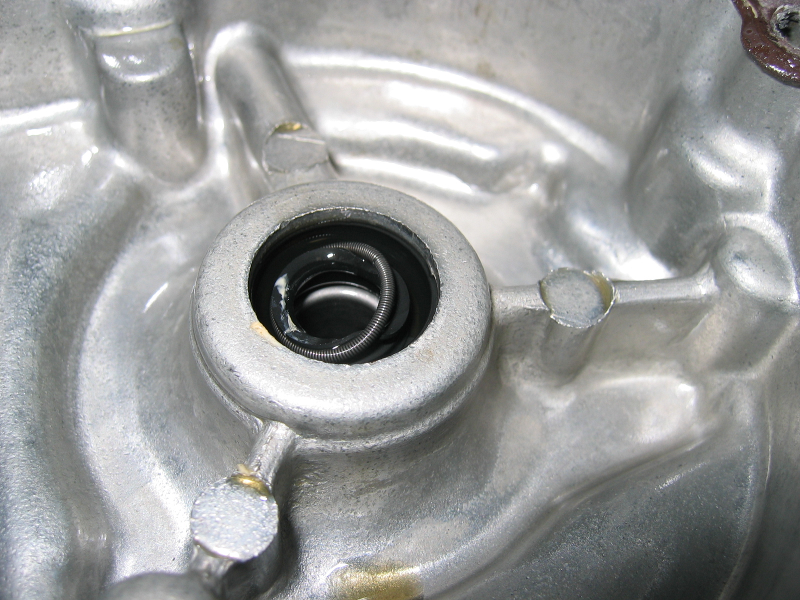 Mystery solved. Why is the water pump oil seal leaking on the KLR? Because the dealer screwed up the install and botched the seal (pic 1):