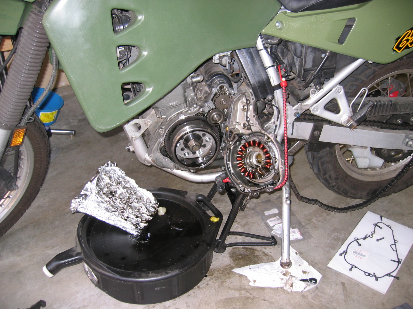 Friday after work (I bailed out around 3:30pm) I came home and worked on the bike. With the proper tools and parts it only took me about 2 hours to replace the seals, verify the balancer had been installed by the dealership correctly and change the oil and filter. I think the chain was off ever so slightly after my last reassembly job because it seems to rotate a lot easier now. I'm sure I'll get better at it as I gain some experience wrenching on the thing. You can tell this picture wasn't taken at a dealership because what's that on the floor there??? A new gasket? Why, who in their right mind would replace a gasket after removing parts of the engine? Just shoot some gasket goo on there and hope it holds until the customer is somewhere else!