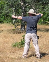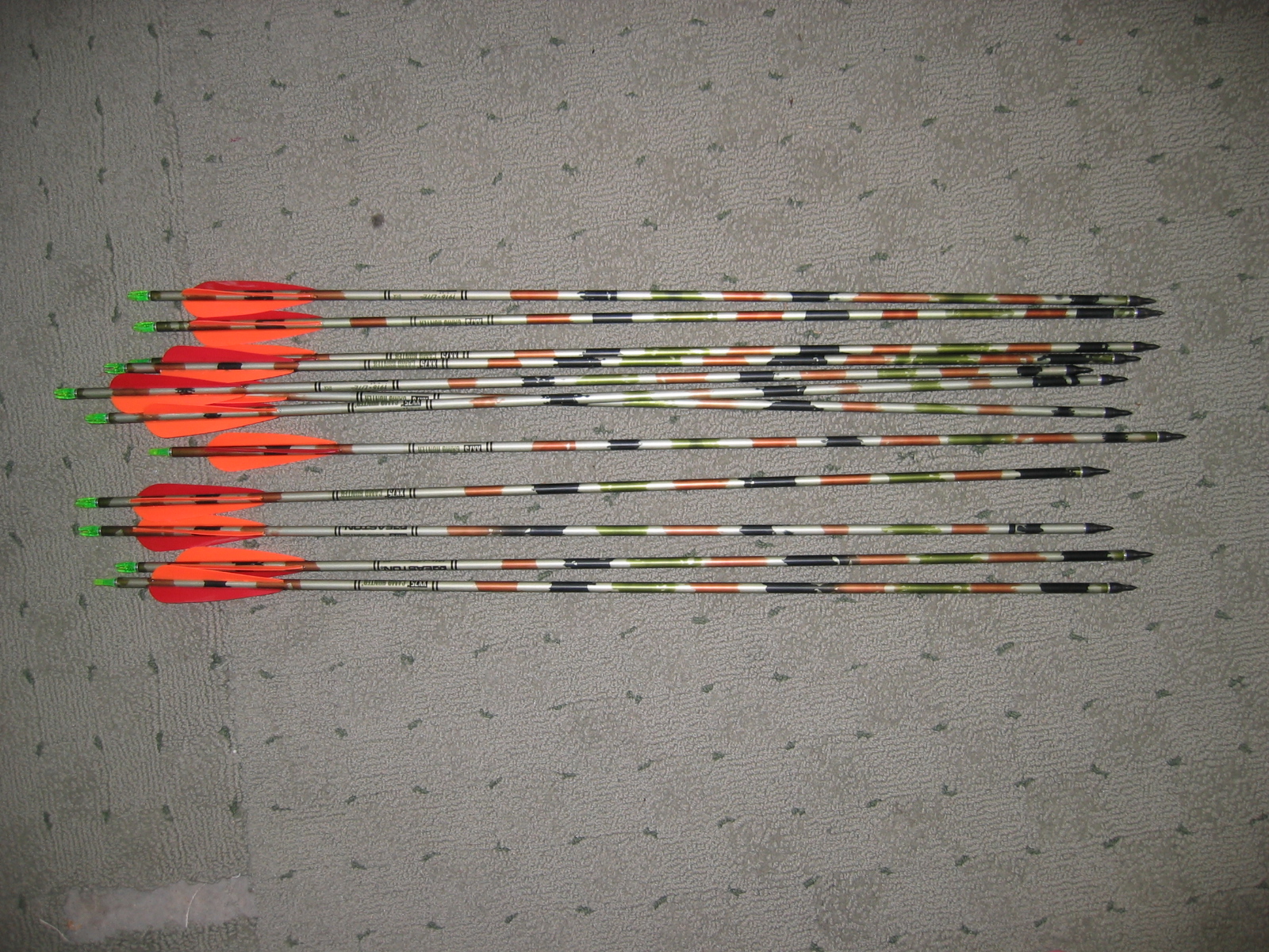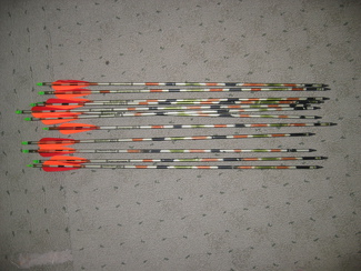 Yesterday while the woman went with Troy to shop for the last of the wood for the table, I went to Gilroy with Seth to check out the archery shop and to replace those broken arrows (I only trashed 4 really, the rest were OK after cleaning... well, they weren't any worse than when I got them I should say, they weren't exactly good to start with). They replaced the main string on my bow as it was dried out from lax of maintenance in storage. Apparently you're supposed to wax the strings every so often. I picked up a dozen arrows with fletchings, knocks and target tips installed for under 5 silver pieces, uh, I mean $70 which is close to the on-line price. They cut them to length to match the ones I already had, so that's worth the extra few bucks. Unfortunately all arrows are pretty much camouflage colored but I got some with really bright fletchings. When practicing it's better to be able to find the arrows in the grass easily rather than worrying about being spotted by the hay bails.