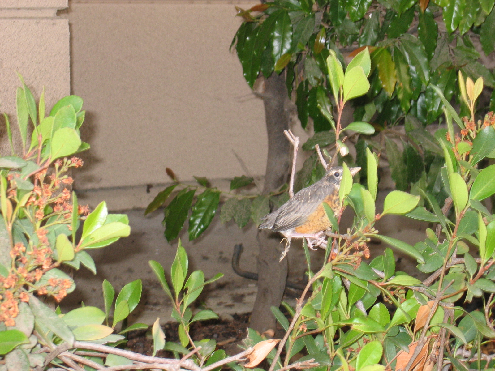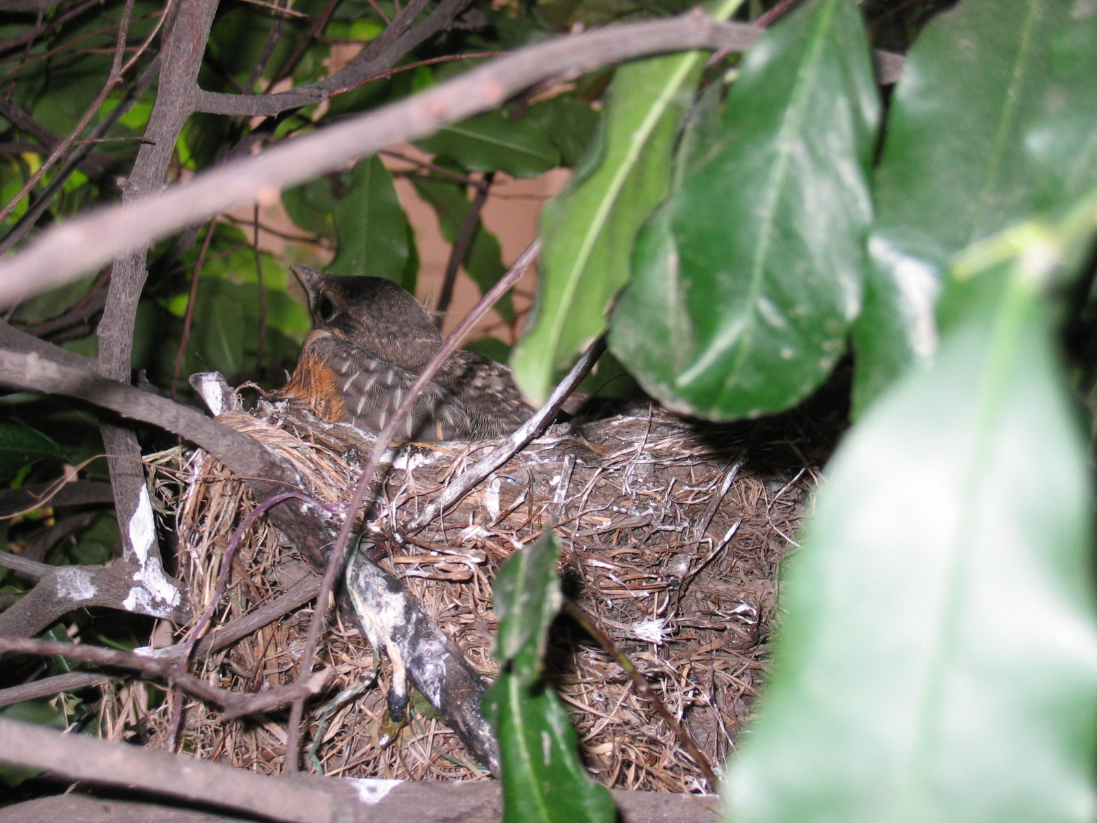 Oh, and she keeps bugging me to post these pictures (why I can't imagine since she has them and she can't see the journal anyway). In the bush outside our garage there was a birds nest and the babies are up and flying. Well, one of them anyway, we found a dead one on the ground just outside the bush. Seems like a dumb place for a nest only 3' off the ground. Good thing there isn't a cat for a dozen miles or so. I took the first photo but she actually went out and sat in the driveway for a while with the camera until the bird flew around. She's nuts.