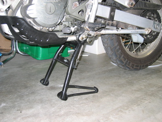 Dad brought by the extended center stand last night and it bolted up with no drama and is actually the right size now. The bike sits back on the 'foot' of the stand so both tires are off the ground which is nice, if it holds. Unlike the BMW stand which balances the bike and let you tip it front/back a bit to get either tire down, the KLR stand just bends slightly when you push on it. Scary. Both tires always up is what you usually want unless you're trying to do the fancy trick of riding off your center stand (which I've never tried).