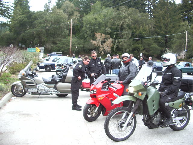 Hey, to JC emailed us the pictures he took at lunch yesterday. Here is the only one I'm in. You can see the Goldwing, and sorta make out the trailer with it's cooler full of diet cokes strapped to the front of it in between the cops there.