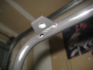 I finally got around to making a little mounting tab to hook the bracket onto the aftermarket crash bar I have protecting the radiator. I cut a little piece of plate with the dremel (it was too small for the torch heads I have), drilled a hole in it, tacked a M6 flange nut on one side to provide threads and then welded it to the crash bar. As you can see from the pic the final product after a shot of Krylon looks pretty good, except for the hole I burnt in the bar tube. Doh. When you want to stop welding you need to STOP, don't slow down, stop, then kill the arc. Burns through thin stuff fast! It seems pretty solid though, the tab is stronger than the crash bar and the weld (on both sides) seems strong. I beat on it with a hammer for a while and it didn't do anything. It's not much, but I made something. Finally.