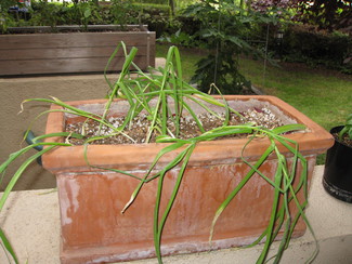 Here we have an update on the corn and garlic. I have no idea what the garlic is doing, it seems to have gotten too tall to support it's own weight. That or they're all dying or something, I've never grown garlic before so I don't know what to expect: