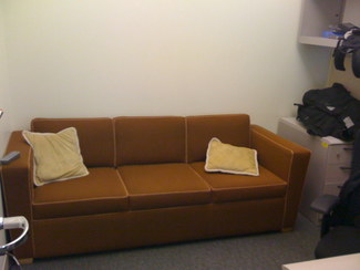 The furniture fairy came by the office today and gave me a sofa. It's fugly, but I have a sofa in my office now. That's cool.