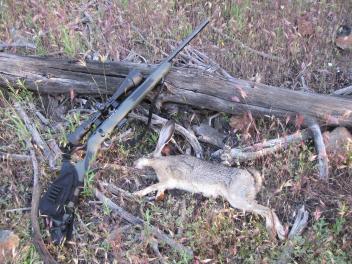It was getting pretty light out so I decided to head back to camp, make breakfast and head home. About half way down the hill I was on a rabbit popped out next to the road and stopped. I shut off the Jeep and he just sat there. Um, OK. I got out and he still just sat there watching me. I went around back, opened the hatch and he just ignored me. I put my headset on, and still he just sat there. I got the rifle out and he went back to eating. I wanted to save as much meat as possible so I aimed high on the body behind the head and pop, he went down like a switch had been flipped. Took him back to camp and it took me an hour to skin and field dress him, but I was very happy to be able to do it all by myself. The skinning knife I got worked perfectly. Once he was all cleaned I could see that the bullet had gone completely through and shattered his spine. Couldn't ask for a better shot (other than a head shot which I wasn't going to try). The traditional rifle and animal shot: