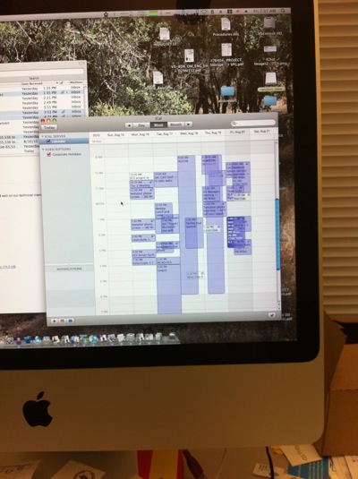 My schedule has been getting worse and worse every week it seems. Here is a shot of next week's ical line-up. Dealing with Austin is becoming a major gig, they're expanding so fast and finding qualified help is hard. Hopefully we'll hire next week, or at least get close so we feel like we've made some progress.