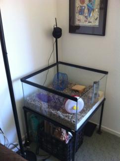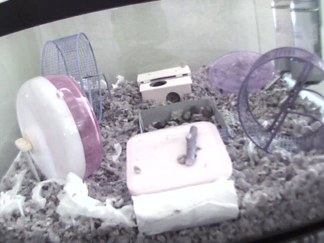 OK, on to more interesting stuff. First up, before I left my 'foscam' showed up. Unlike those linksys cams I tried last year this one actually works and doesn't crash. Setup was easy even without the windows based software (usual DHCP, get the IP out of the router and hit it with a browser) and what's extra bonus cool is there is a foscam app for the iPhone so I can pan/tilt the camera while viewing it via the phone. Damn handy. To make the woman appreciate it I set it up temporarily (I think!) pointing at the hamster cage. She loves 'hammie cam' and watches it from work now even though they don't really do much during the day. At night the IR night vision actually works and you can see them running around doing their hamster stuff. A typical daytime shot of hammie cam where you can see nothing but wheels and toilet paper everywhere.