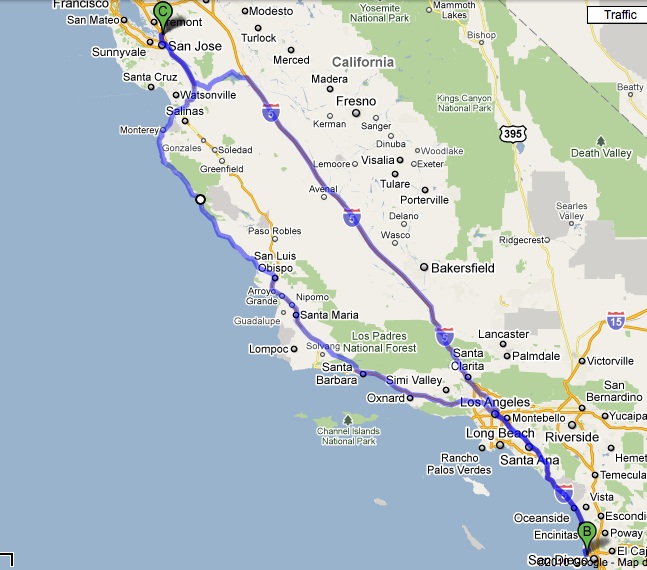 Here is the route I took, hwy 1 on the way down, right up I-5 on the way home. I left the beach house at ~9am and got home at 5pm. The woman left the beach house at 2pm and got home at 6:30pm. Lots of overhead on those flights!
