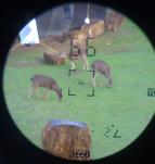 Today is the jeep meeting so I drove in, and it's trying to rain so I lucked out. Instead of sitting in traffic on the way in though I did a quick workout at home and then went to the archery range by work. I didn't actually shoot all that much, mostly I just hiked around the field range carrying my bow enjoying the smell of the woods after a rain. I really need to get out for a real hike one of these days. When I came back to the parking lot a flock of deer had taken up residence on the practice range again. I managed to take a picture with the phone camera through the rangefinder. Not as easy it would seem. I ended up getting within 24 yards of them before they ran off, but I couldn't get a pic of that. They had enough of me standing there trying to line the phone up with the eyepiece and ran off.