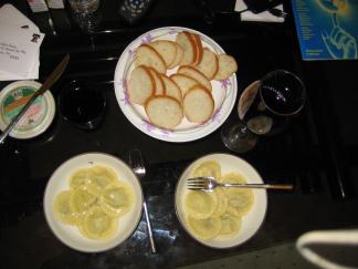 The next major accomplishment, which took longer than putting up the shelves, was making pasta using the new pasta roller gadget. The woman made up the dough and I made up the filing (a combo of pork, beef and cheese) and then I rolled out the dough and made/cut the ravioli out using the cutter we got at CIA. They turned out OK, although the dough was a little too thick. We need to run it though one smaller setting on the machine next time. I think it took 5 hours to make this batch, so it's not exactly fast to make dinner, especially when you have to dry the pasta for hours between stages. We froze a bunch of them, hopefully they'll cook up well so in the future we can make a really large batch and save them for weeknights. The pasta book we got was originally written in German and translated to English later. That must be why they refer to some store bought ravioli as insipid. Not a real popular English word, even if it is 100% accurate to use in this context.