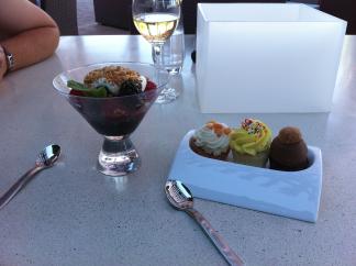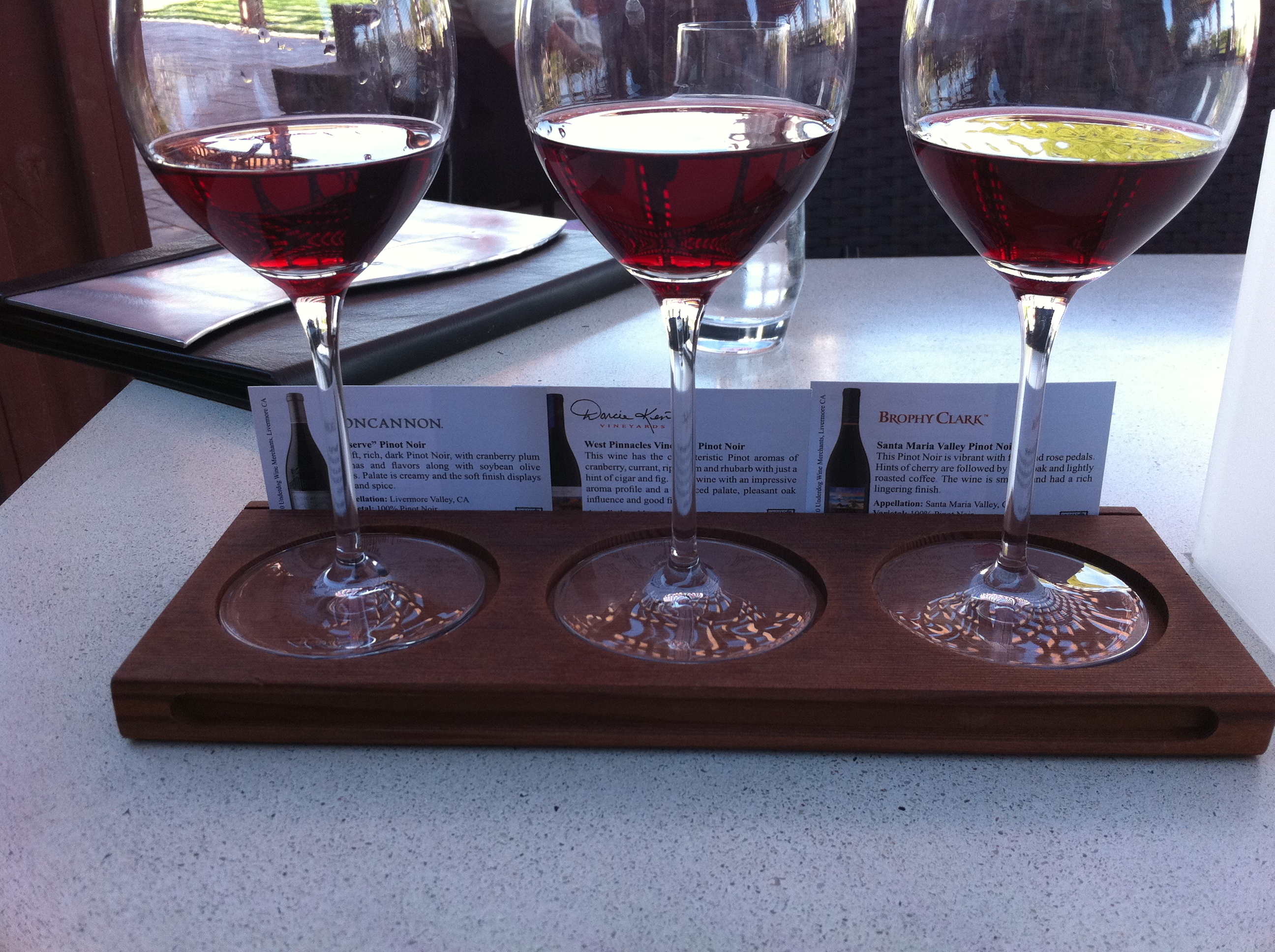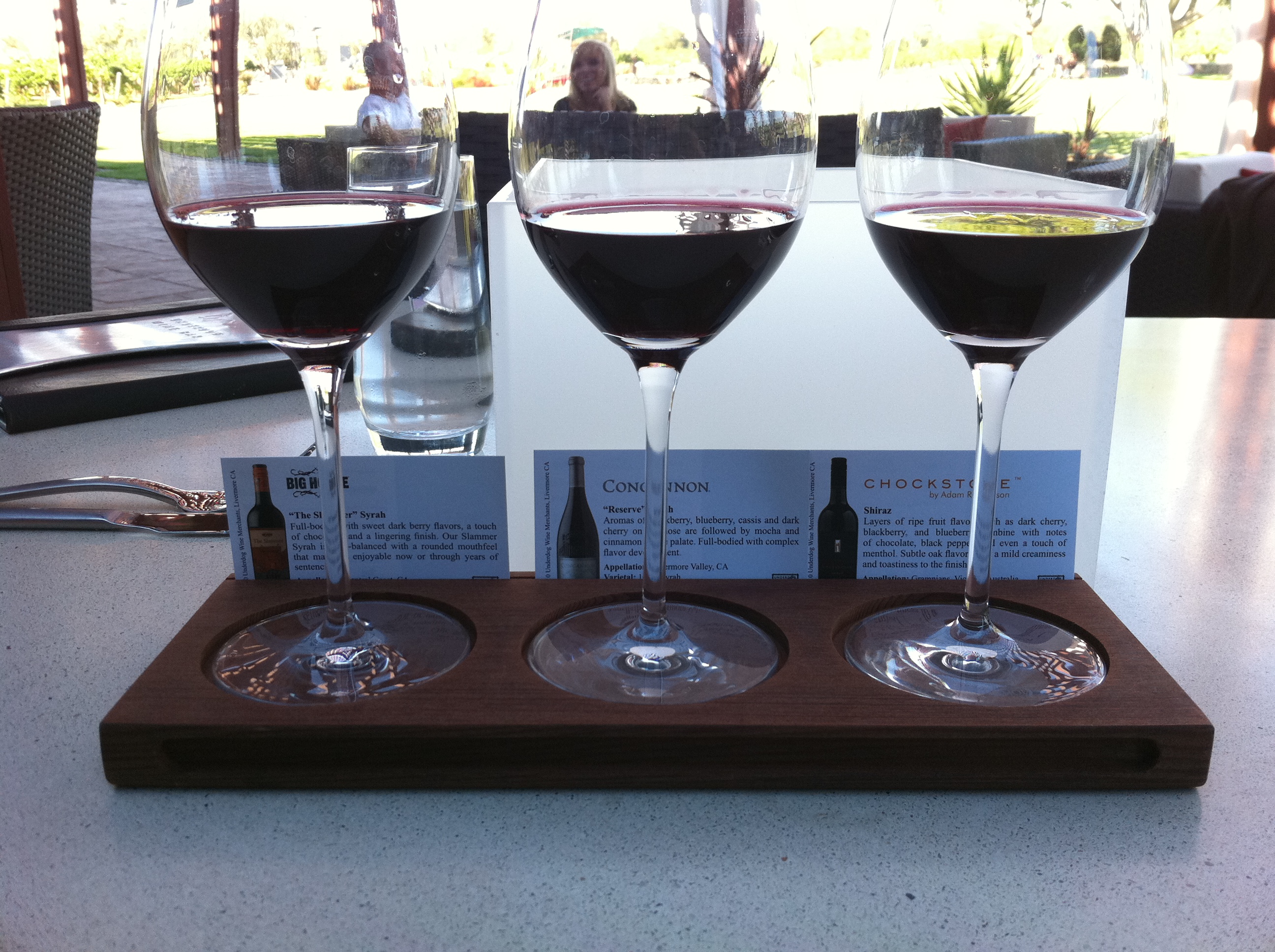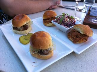 Yesterday, after much housework and whatnot in the AM while the woman rode, we went up to Concannon Vineyard and their "Underdog Cafe" for some food and wine tasting. They offer 2 oz pours of over 50 wines so you can try lots without getting trashed (important for us lightweights). We had a couple of 'flights' of 3-wine samples, a cheese plate, the burgers and sliders seen below, desert and brought a bottle of wine home all for only $110 with tip. That's pretty reasonable. The food was good and it was fun to try wines with and without food to really get a feel for why different wines are good for different things.