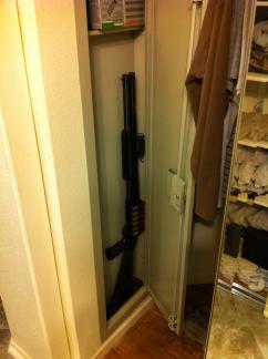 Last bit of picture fun is of the cabinet dad and I installed. It's a shitty sheet metal box but it's approved by the CA DOJ so it at least looks like I'm trying to keep my home defense weapon safe. I'll feel better knowing that the 12 gauge is available instead of just the .45. I've tacked a weapon light onto the pump and put the side shell carrier on so it's got 7 in the mag (using 3" shells) and 6 on the side. Plenty.