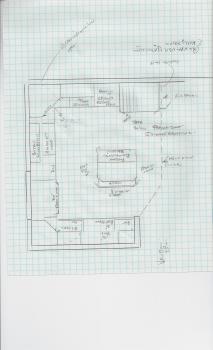 After I got home from the lesson the kitchen guy showed up and did a bunch of measurements, showed us samples from his showroom trailer, etc. Total cost for the kitchen was quoted at $83,000 + appliances + paint + permits + fixtures + door hardware. Um, that's a $100k for a kitchen? WTF? Pass! Here is a sketch of the design: