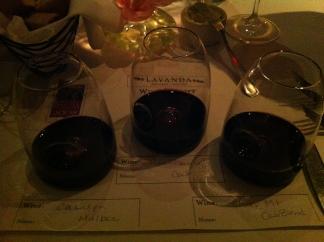 Last night we went to Lavanda (menu) in Palo Alto with Felice and her... well baby daddy I guess since they're not married and 'boyfriend' just sounds not quite right. Anyway, I won't go into details about the restaurant or the meal because although the service was good as was the wine, the food was just not that good. The lamb on my mixed grill sampler special was not even close to as good as ours and the other meats were OK but not worth the price. The seasoned kabob wasn't even as good as the stuff you get out the back of Rose's market. The pick your own wine flight thing was fun though: