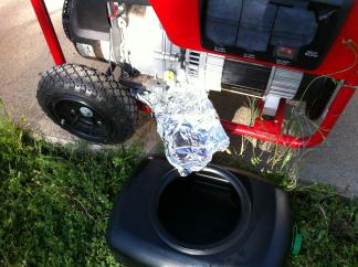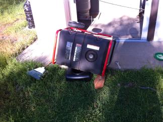 In the morning I went to change the oil in the generator, and if I could have gotten either of the drain plugs open without risking stripping them (I only had an adjustable wrench, I didn't think to bring the sockets) then method #1 would have worked. Nice foil tray under the drain bolts leading right into the bucket. However, since I couldn't get the drain bolts out I opened the inspection hole and.... tipped the whole thing over as seen in picture #2. The manual says you can do that as long as you don't tip it toward the spark plug. OK, I can not do that. I left the drain pan and whatnot up there, at .8 quarts per year of oil changes it will take 10 years for me to fill that waste container.