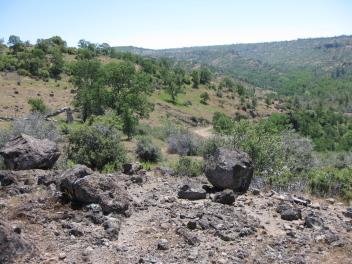 On the way home I stopped by the Tehama wilderness area (about 35 miles off I5 by Red Bluff) to see if it would be suitable for a camping/shooting weekend. It's really an ugly place, lots of scrub and small trees and rocks and stuff. I was running short on time so I didn't get to explore much but I found that good firing position pretty easily. We could setup next to or actually use this rocks as a rest and shoot down onto the hillside in the distance. The road goes all the way across the valley so we could drive to/from the targets. Not 1000 yards but at least a good 500 without risking shooting across the road.