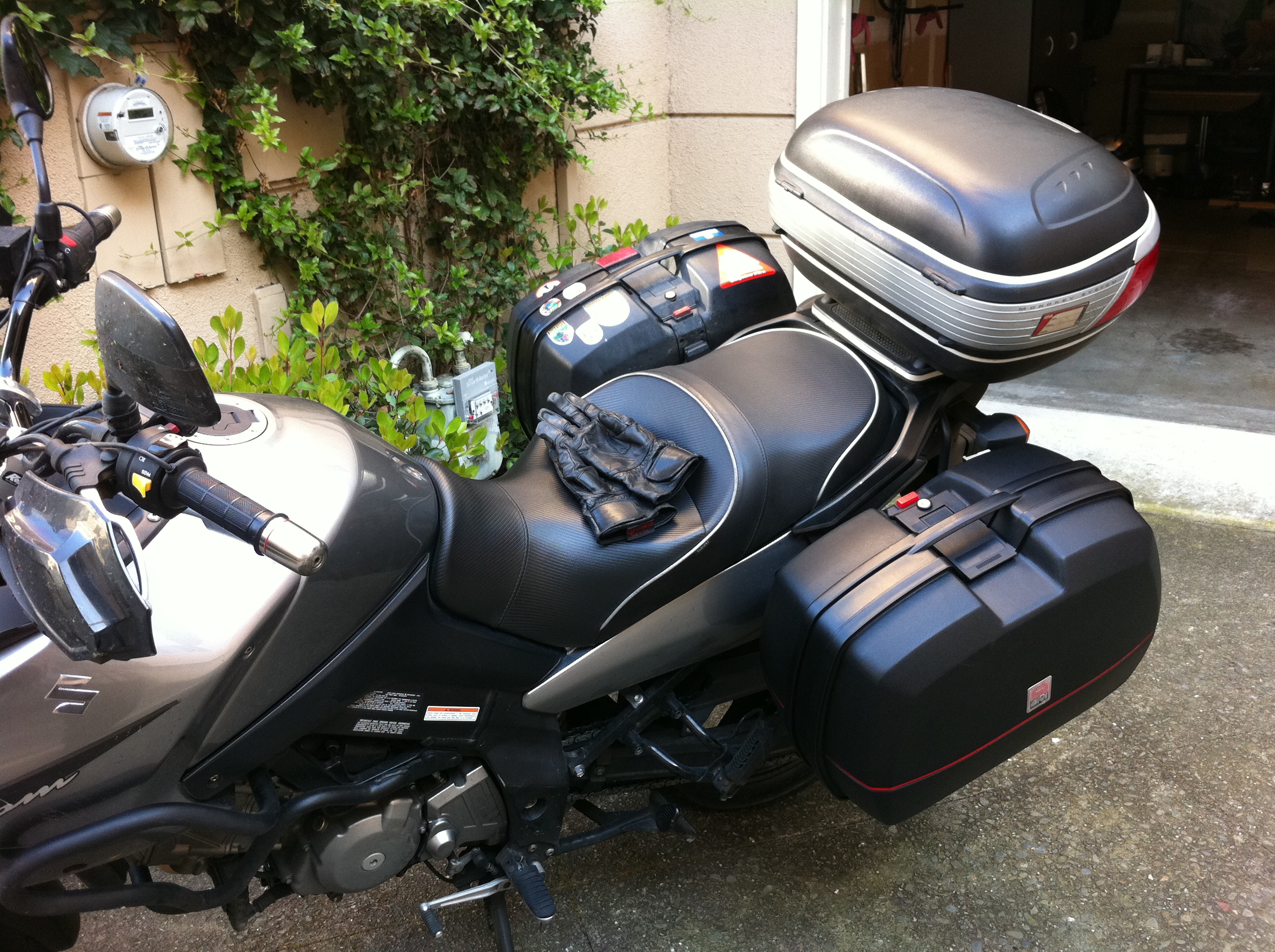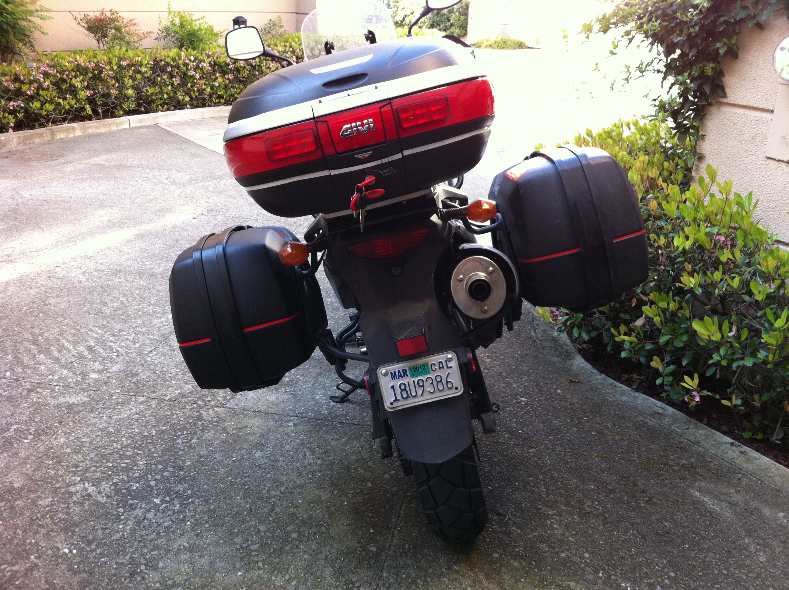 How much luggage can you bolt onto a bike? Well, lots. I wanted more room so I can easily pack my riding gear on the bike when I arrive somewhere which should let me ride more places and not be uncomfortable when I'm there in riding gear. The E21 bags I have are too small to make it fast and easy so I got the E45 which matches the old KLR top case. They're huge but do give me enough room to do what I want, even if the drop the MPG of the bike by 4 when they're on there. It also makes the bike handle funny in high winds (like between here and I5 toward Tracy) but if there is a god I won't be on that road too often with or without these bags attached.
