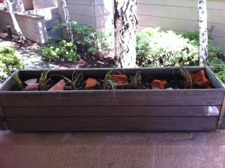 We had this rectangle terracotta planter that would just suck the water out of and kill anything we put in it so I used a hammer to turn it into fragments we put on the top of all the planters. I'm hoping it keeps the squirrels from digging in the planters and hiding their nuts. If the woman would just stop putting nuts out for them they wouldn't do that but she wants to feed the squirrels. Let's hope my anti-squirrel defense system works.
