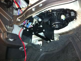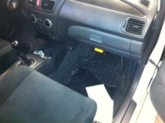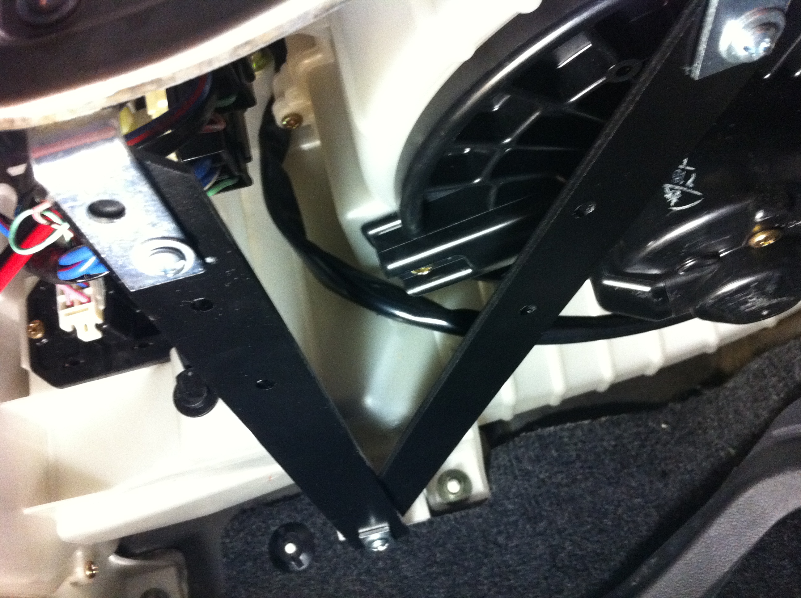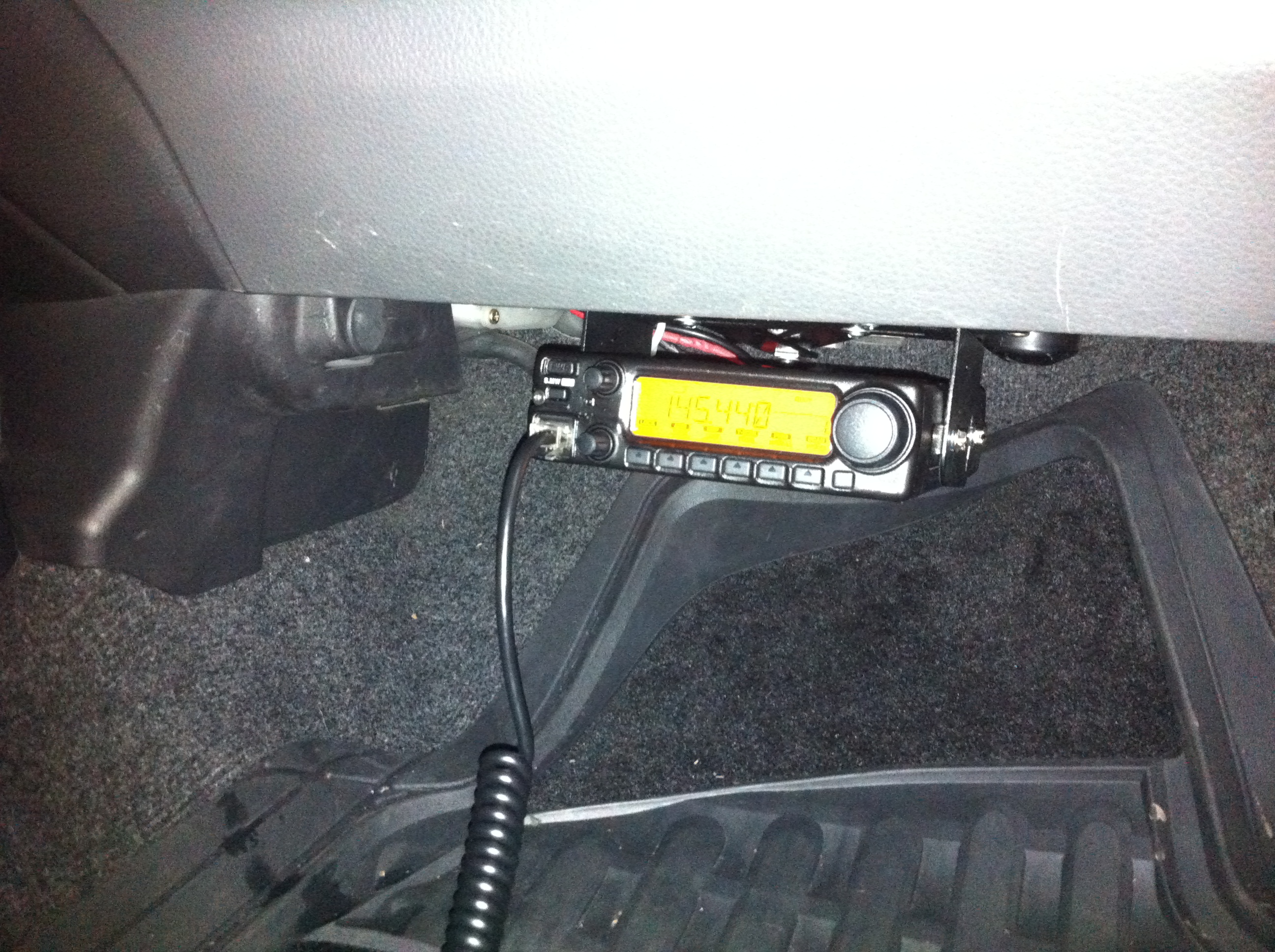 Once I got the Icom home it became clear that it was larger than I thought and it wouldn't fit in any of the places I thought it might. The only spot was below the glove box (won't fit in it in any way that I could actually use the radio once it was installed) but there is nothing solid under there to mount it to. Took a bit of looking but after a trip to OSH to pick up some brackets and a piece of 1"x1/8"x3' flat bar, and some work with the drill, dremel and some blocks of wood I crafted a mount. I only had to drill one hole, everything else I reused existing holes or mounting points. It may look funky but it's really strong and I only had to use 2 washers as spacers to get the radio to mount level with the bottom of the dash. Woot!
