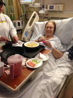 Mom is still in the hospital, hopefully she's going home tomorrow. She'll spend 1 night in a hotel by the hospital in case there are troubles then head back up to the mountains. Dad was smart to build the house without stairs since it's going to be a while before she can walk correctly again. I love that the side order of carrots and celery sticks was exactly 3 of each. I expected a bowl or something, but I guess they keep the portions small, can't have people OD-ing on veggies.
