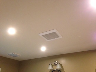 Another project on Sunday was replacing the weak ass bathroom vent fan. The ceiling paint is starting to show signs of moisture damage because the fan is pretty wimpy (50 cfm). I wanted to replace the one that's in there but it's wedged under the joists in a spot with very little clearance so I couldn't actually put a larger fan where the existing one is. Instead I put a 140 cfm fan right sorta in the middle of the shower area hoping it draws from the whole shower opening instead of just one side like the current fan. So far it seems to be working really well, and since I shortened the vent run over 6' and took 2 bends out of it the fan can actually get the steam out.