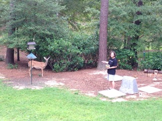 The deer don't even really run away anymore when the woman goes out to reload the feeder and whatnot. She can get them to come up to the porch when she's throwing them melon rinds but usually they run away when she walks down. Apparently not so much anymore.