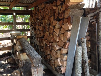 With the woodpile crash still sitting there looking at me I decided to bust out the chainsaw and splitting maul and split and re-stack all those rounds. By cutting a big X in the hardwood rounds with the chainsaw I was able to split them into 4 pieces, usually with just a few whacks of the 16 pounder. Some were still too wet and/or hard and/or big for me to split by hand so I went ahead and split them with the chainsaw just to get it done.