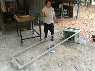 I whacked together the frame for the wind blocker for the coop and the woman is busy painting it before I attach the tarp. I needed it to be just about 1" over 8' long, but the scrap boards I had were exactly 16'. Rather than cut two boards and have to pieces of drop I just connected the boards on the "inside" on one end but the "outside" on the other making the entire frame 1.5" longer. Perfect and all it required was about 3" extra length on one of the end pieces.