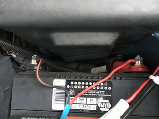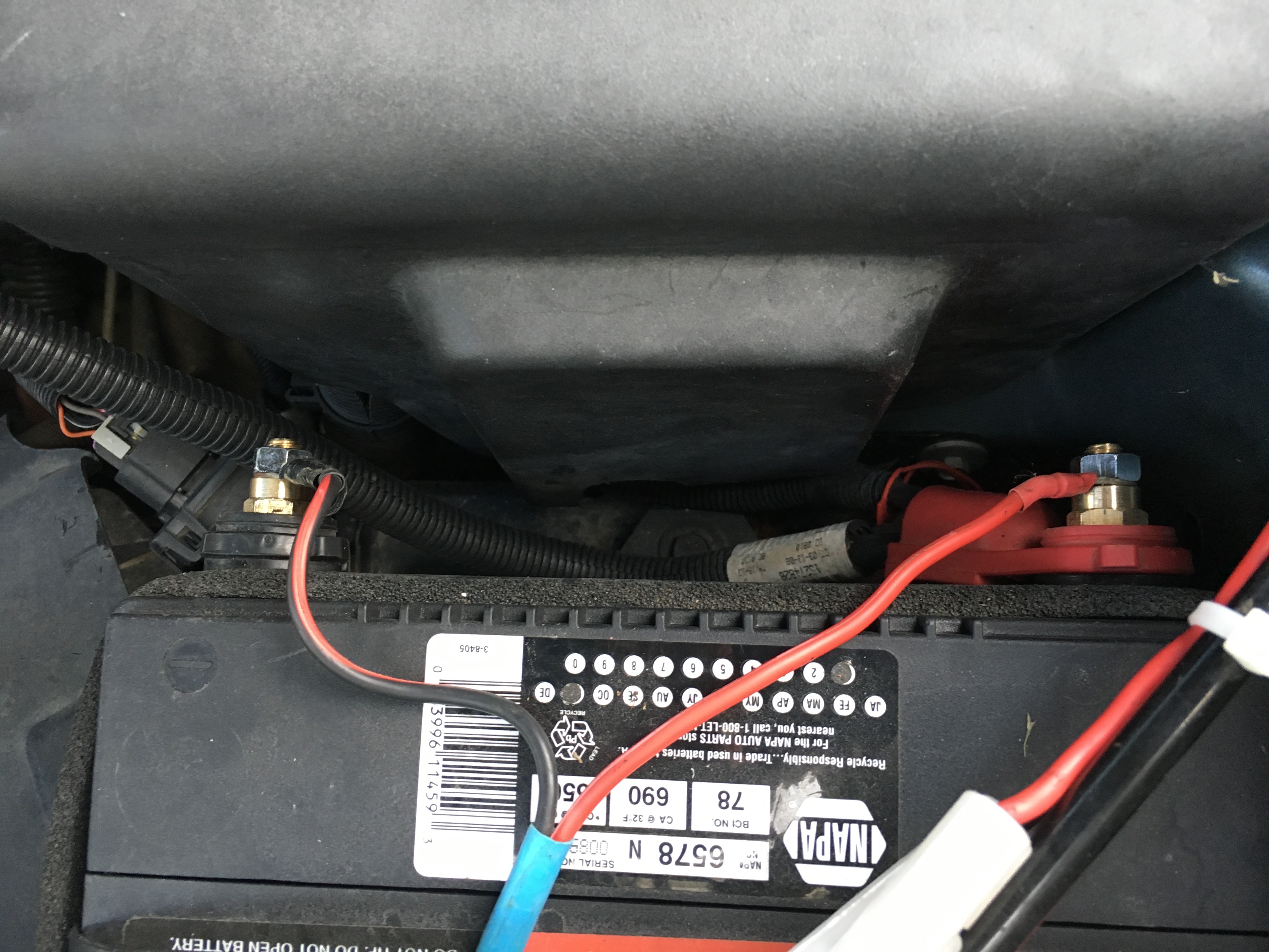 First problem was that the GM battery setup is for a side terminal battery. No biggie, except by default they don't have a provision for adding anything onto the terminals. Aftermarket companies make side terminal adaptors that have extra bolts on them so you can add ring terminal connections to the battery. The local auto parts place had them, so it was an $11 fix to get my wires connected like I wanted them.