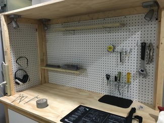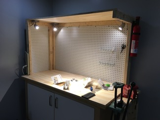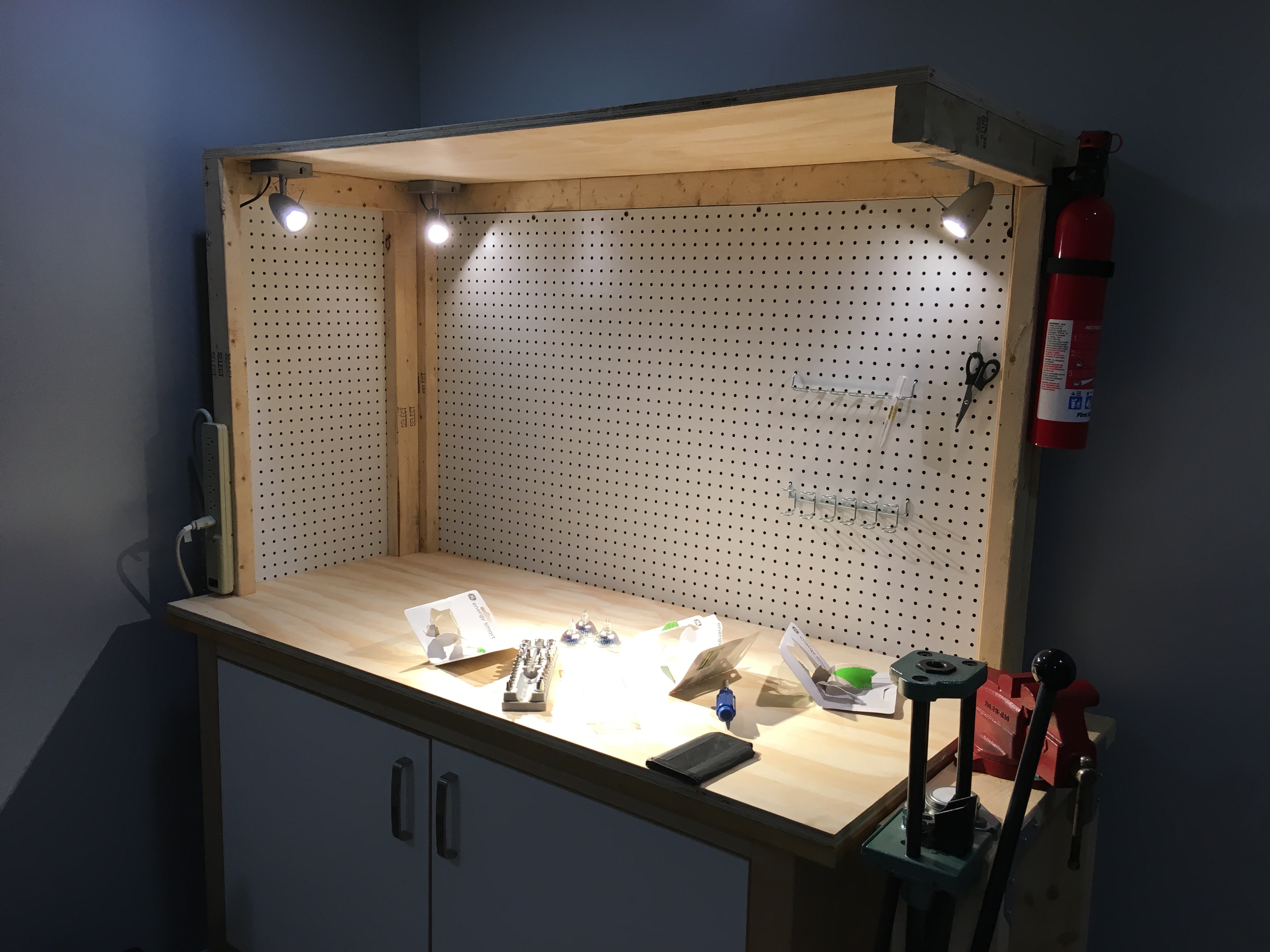 I wanted to create a 3 legged top for my loading bench so that I could hang some peg board on the back and add some lights, as well as have a shelf for some bins of misc crap that are currently in the closet. Dad and I went to Home Depot on Friday to get the materials and did most of the structure and today I did the finish work. The lights used to be on top of the bookcases in the downstairs living room in the Milpitas place and since the move they've just been in a box. They were using 20W halogen bulbs which get really, really hot. I went to order some LED replacements on Amazon but since I had to run errands today anyway I checked Walmart... and they had GE bulbs of the right type and everything for $8. Cheaper than amazon! They only had 3, but I only needed 3 so win all around for me.
