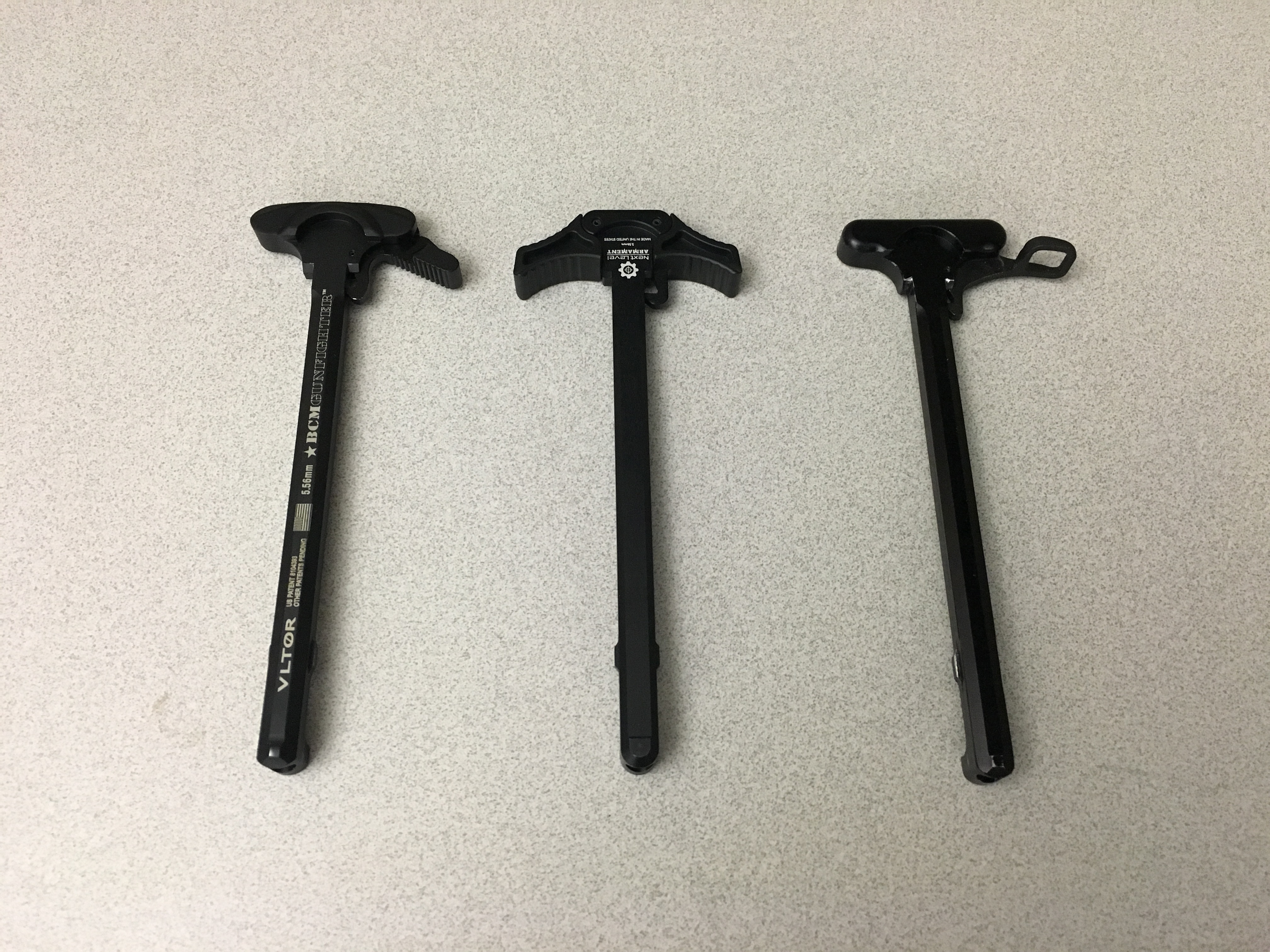 With the flip-up rear sight on the SBR it's sorta hard to get to the charging handle. I asked one of the AR crazies in the office what he thought of several I picked out, and he actually had 2 of them. I pulled them out and brought them in so I could try them in the SBR and see which I liked the best. I like the badger and the BCM, didn't like the ambi twin grabber version in the middle. The BCM is expensive because you have to buy the whole unit, the badger is something you can add to your existing handle which is what I'll end up going with. I'll do both the SBR and the "real" rifle just to make them consistent.