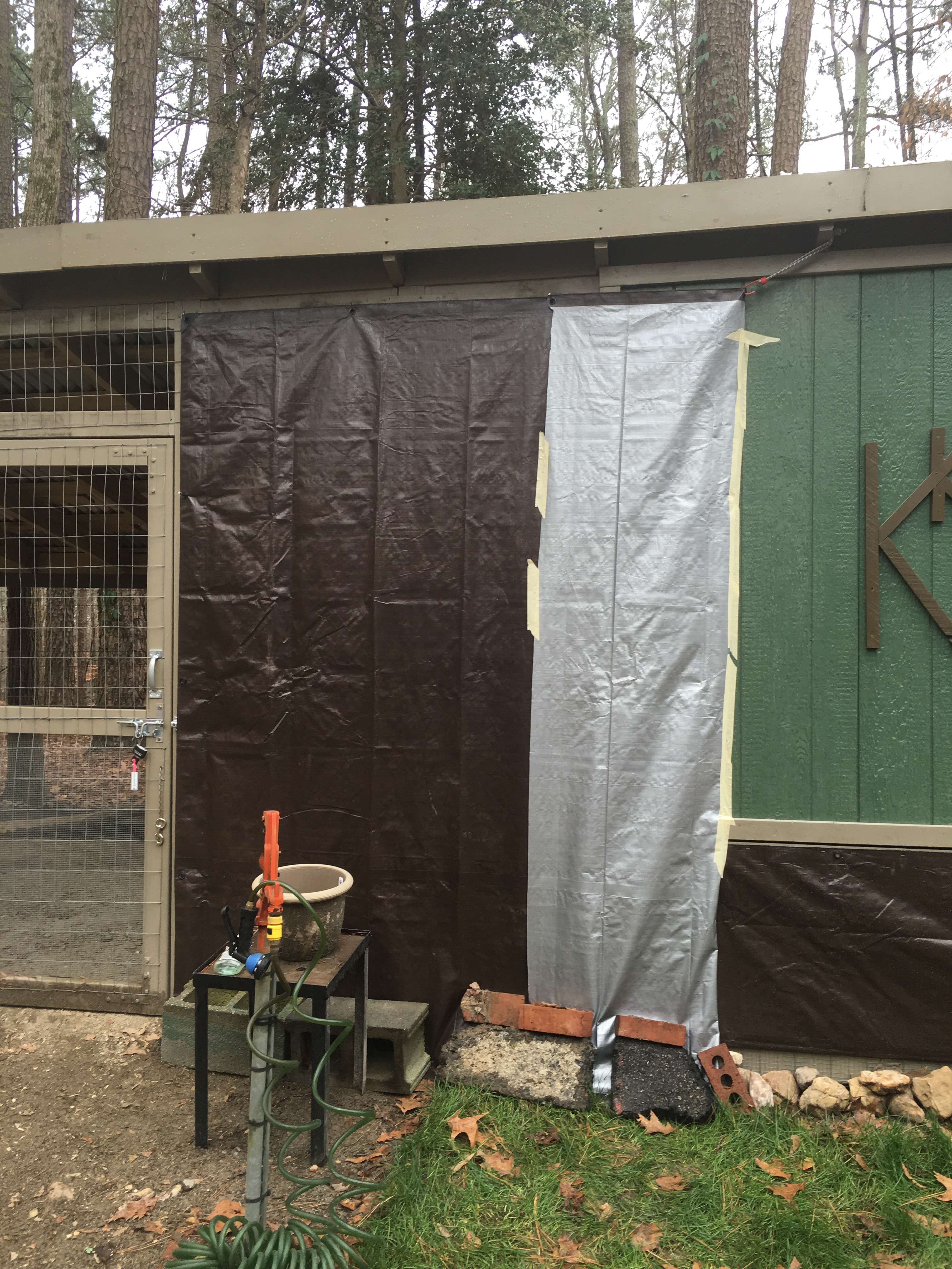 The woman is worried about the cold and wind (had some snow/sleet coming down for a few minutes today) so she wanted to block off more of the run. It's ghetto as hell, but it might last the two days of cold weather we're supposed to have. I kept telling her that masking tape won't stick to damp wood, but she's convinced it will. The top and left side are held in by the grommets in the tarp over some nails I put in the 4x4 and header.