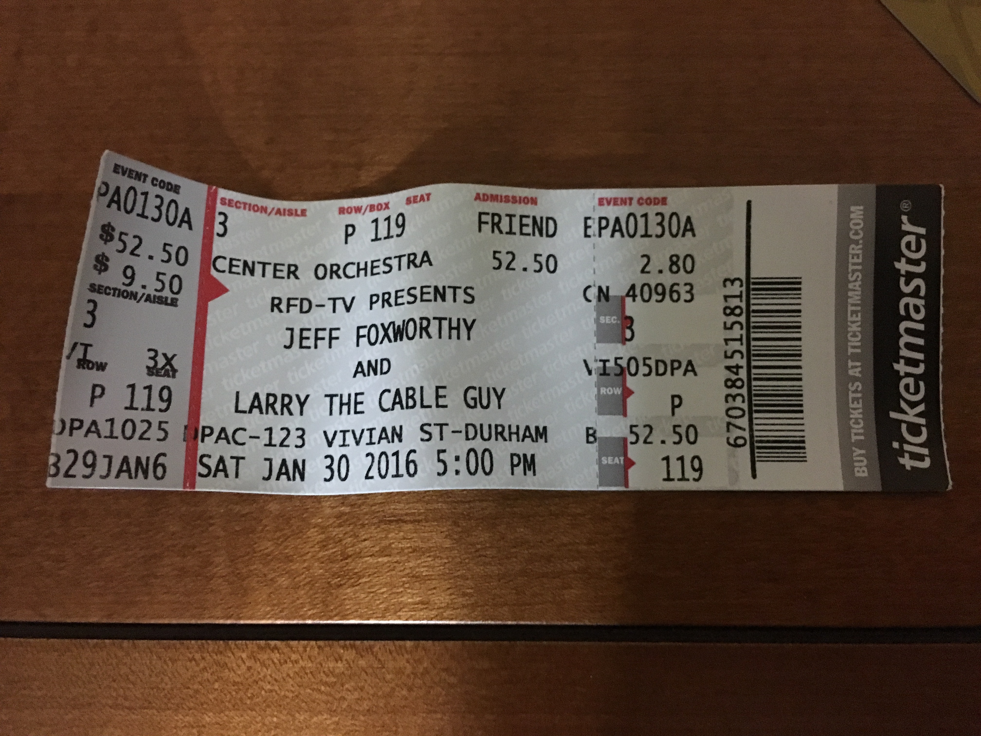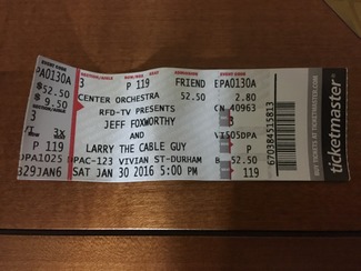 Last night we went to see Jeff Foxworthy and "Larry the cable guy" at DPAC with the woman's trainer and her husband. We got the tickets 6 months or so ago and I had sorta forgotten about it. The show was actually pretty good, both guys had updated material that was true to the original but fresh. I tried to class it up a bit by getting wine to go with my pretzel. Didn't really work...
