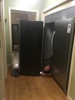 The new fridge and freezer are in and it was a good news / bad news sorta deal. The bad news is that the 72" or whatever measurement in the store was not the size of the fridge we got. They must have had it sitting up on top of something because the stuff we received was more 'normal' in height. The good news is though that the trim kit on the old setup worked on this one. The upper trim was actually two pieces put together, so I just removed one of the pieces and the resulting trip blocked the gap at the top perfectly. The units came with bottom trim, but the old single length piece went right on as well. So that's done.