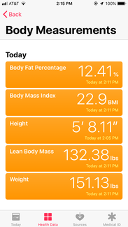 My fancy scale came in today, so now I can start recording weight, body fat, etc in the health app. It looks weight wise pretty close to work considering at work I weigh myself naked before a shower and this reading was taken while I have 3 layers of stuff on (it's cold in the house!). To be consistent though you have to take them at the same time of day, so I'll be doing one weigh in each morning right after I get up and pee.