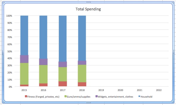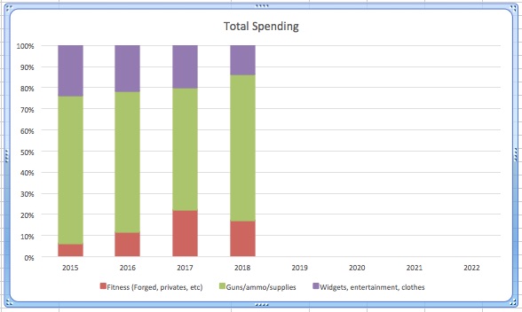 Screwing around with more charts on my spending. Guns/ammo is a huge portion of my discretionary spending, and a non-trivial part of my total spending. Wow.