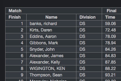 And this is how the match turned out. Ian had some new fancy race gun so we expected him to do well and he did, but me coming in 4th was totally unexpected. I smoked guys running gear costing 10x what mine does, and some of the regular top shooters. So either they all had a bad day, or I'm getting better. Let's hope it's the latter, but next month will tell.