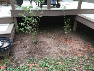 Some spring cleanup outside. First off we pulled the butterfly bushes out of the memorial area and replanted them where they'll get more sun. They were leaning way over trying to reach the sunlight, apparently they want more sun than shade, or at least the variety we got does. Hopefully they'll do OK here, it's the sunniest spot in the yard other than the garden box.