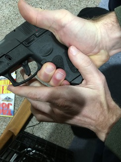 Ran some serious drills with the G2c today to see if I wanted to try a match with it. It fits perfectly into the M&P holster so I can run it without having to buy anything... so should I? Right now I've got a nice chunk out of my right palm that's bugging me. Not from the gun per se, but from my left thumbnail poking into my hand during reloads. Odd, but it sucks.