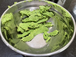 The woman suggested I skip the time consuming and messy step of pushing the mixture through the tamis and just not worry about the 'grit', but had I done that it would have proven a disappointment. On the left is the processed, uh, slurry/baby food and on the right is all the junk that was pulled out via the tamis. That's a lot of crap that shouldn't be there, and the end results are worth it.
