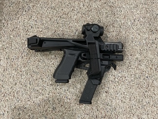 OK, so I got this thing. It's the Recover 20/20 brace. They've been out for a while, but when they didn't have that optic mount option they were pretty useless. You had to get down so far on the brace that it was unusable.... except as a brace which is dumb. With the new optic mount even Hop on TFBtv said that it's usable for something. He's not sure what but as a range toy it's fine. Rather than get another 9mm carbine/pistol thing like an AR9, I just got this. Much cheaper, and it lets me put rounds through the G34 which is always a bonus. When folded it goes into the holster which protects the trigger.