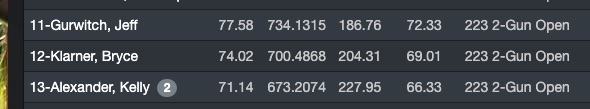 Another match today, and I'm upset about it. There was a target that required 3 hits that was partially obscured by a barrel. I hit the barrel and saw it, so I made up that shot. The target had 3 hits in the -0 and one hit in the -3 that was clearly the round that skipped off the barrel since it was in the target sideways. The RO said 2 of my hits didn't count because they too went through the barrel (which I call BS on since they were perfectly round holes in the paper and that's not what happens after it goes through a barrel) so he scored me as 2 misses. 10 seconds of penalties, put me in 2nd in division and dropped me 2 spots overall (to 9th). Still, 8th (ignoring the PCC guy) isn't bad out of over 80 shooters.