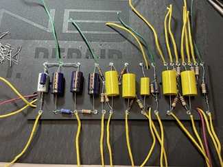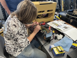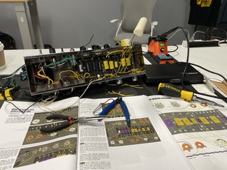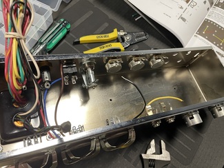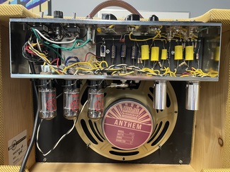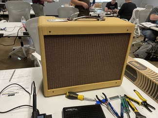 That amp class was earlier this weekend, two days of heads down fiddling, soldering and debugging a 1950s Tweed Deluxe amp. The cabinet was built but otherwise we started with a bare chassis and added in the physical connectors, knobs, etc...